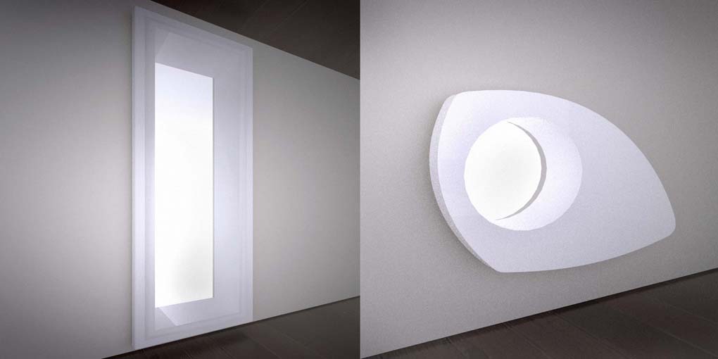 Bisque Radiators Competition Finalist The two designs, place the radiating elements within the reveal of a wall opening, or surrounding artificial light sources. |